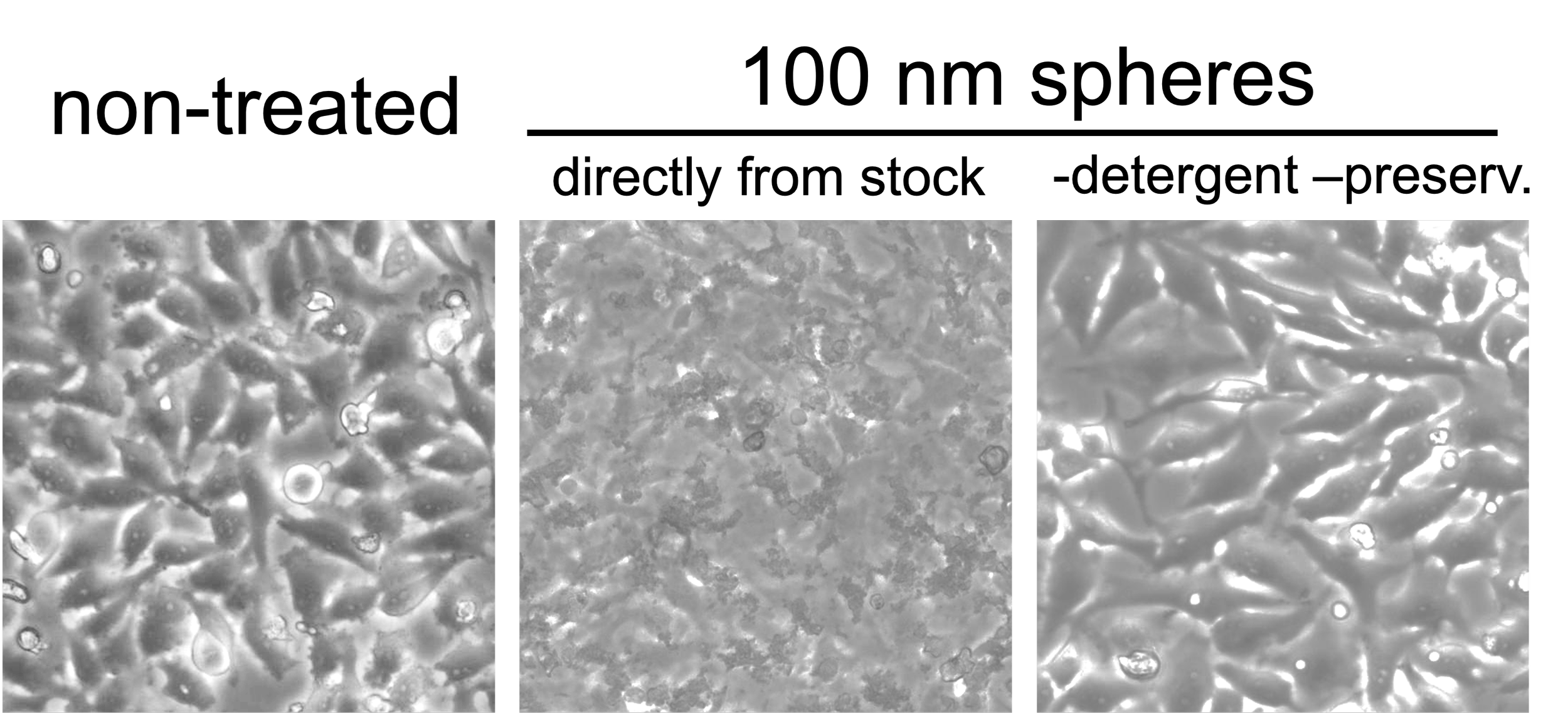 In our experiments, HeLa cells exposed to polystyrene nanospheres (from a major commercial vendor) at the upper end of commonly used conditions (100 nm, 500 µg/mL) showed rapid cell lysis within 1 hour in the absence of serum.